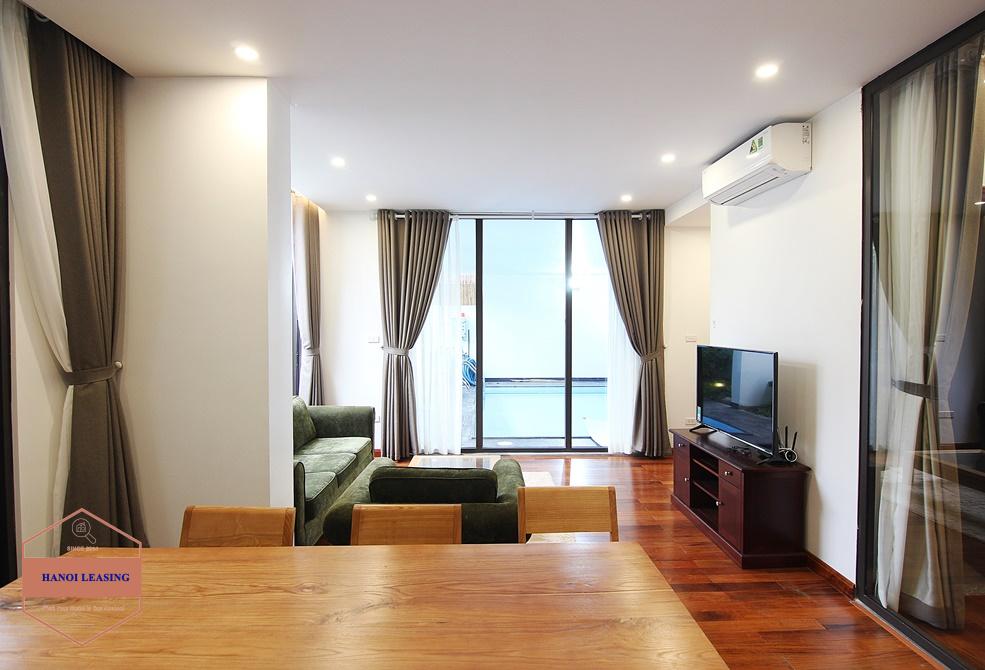 Modern and brandnew 02 bedrooms apartment with swimming pool for rent in Tay Ho street. The total living space is 90sqm, located on the ground floor, included spacious living room, big kitchen with enough utensils, 02 bedrooms, 02 bathrooms, next to swimming pool and fully furnished with modern quality. Located on good area, close to the lake, restaurants, shops, etc..