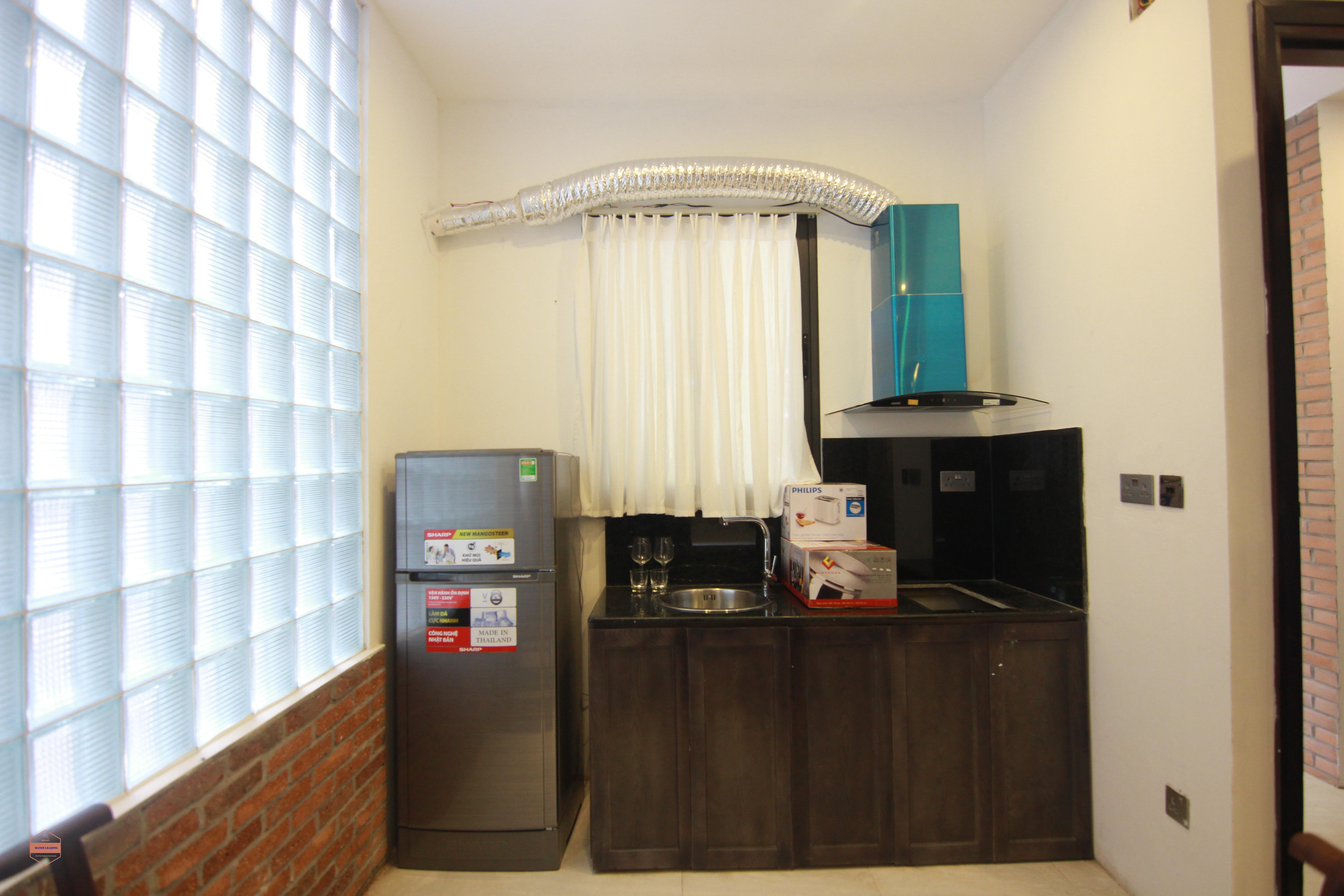 New apartment for rent in Tay Ho district. The apartment on the ground floor with bedroom cnect to the living room and kitchen area, modern bathroom with shower cabinet, motorbike parking.