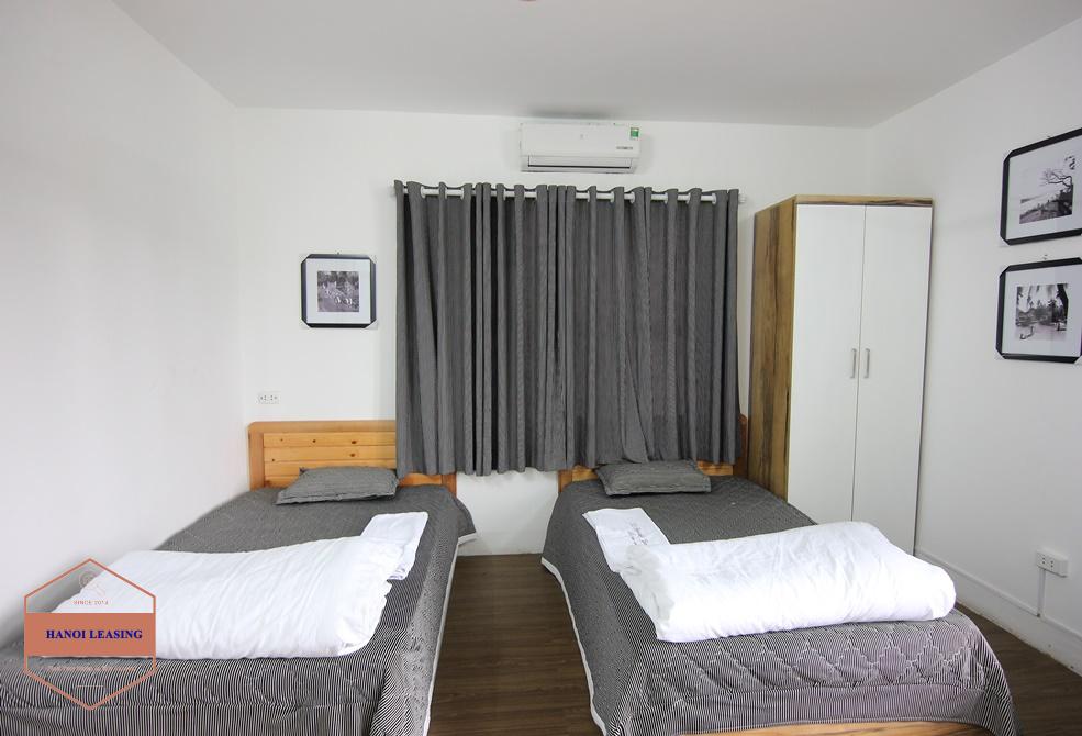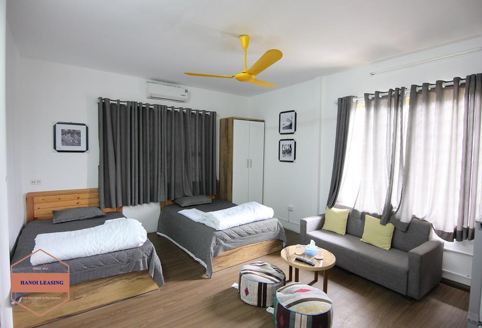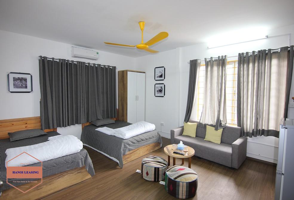 A small yet modern and full of light studio apartment to rent in Tay Ho. It is located in Dang Thai Mai alley, quiet and peaceful neighborhood with no constrcution and no rooster. The apartment itself has a small balcony, two single beds or a double bed, a sofa set with coffee table, wardrobe and a kitchenette.